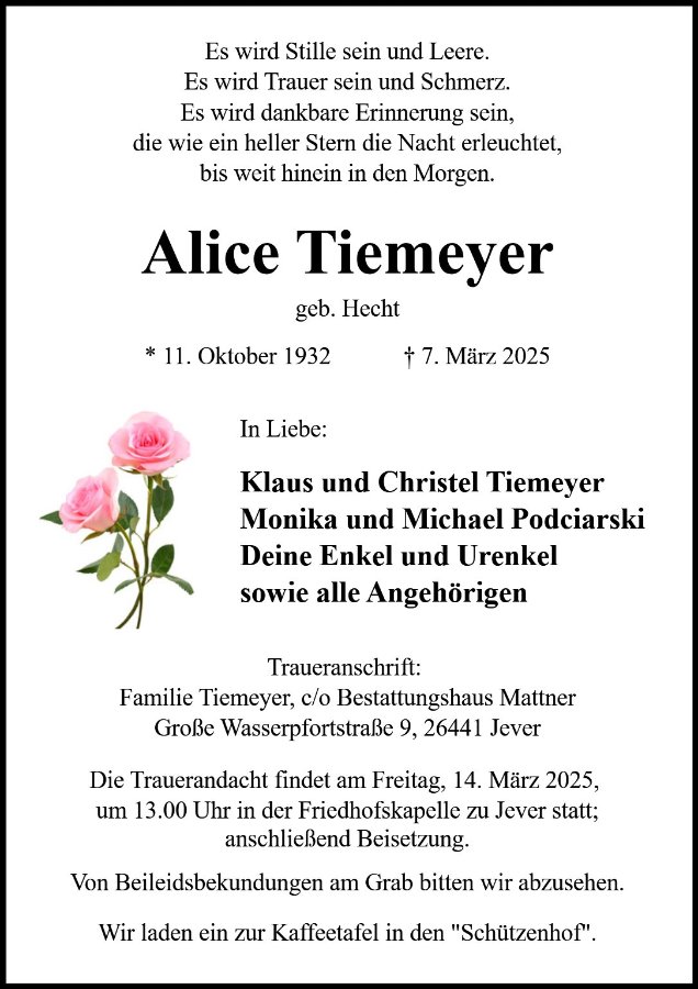 wir wünschen Ihnen für die kommende Zeit viel Kraft und dass es Ihnen gelingt, dankbar auf die positiven Erinnerungen zurückzublicken. Diese Gedenkseite möge Ihnen dabei helfen, Ihre Trauer zu teilen und das Andenken gemeinsam wachzuhalten.